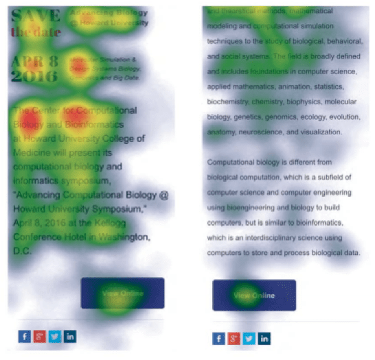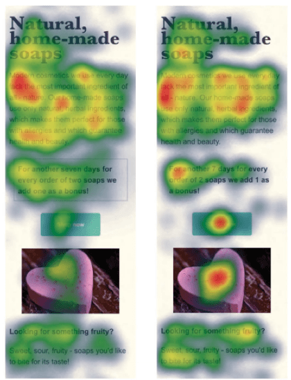 - Call to Action location. Surprisingly, as shown in the heat map below, placing the CTA closer to the main image may mean the CTA receiving more attention than when it is further away.