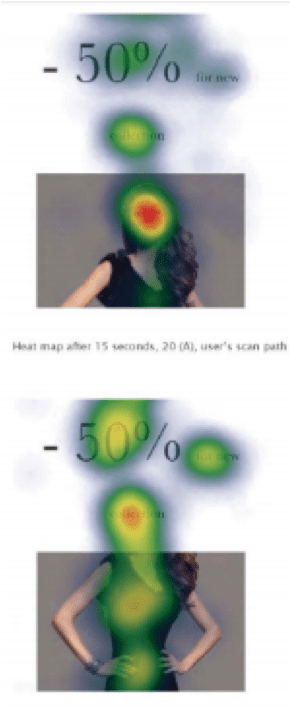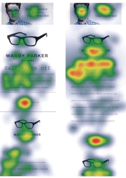 - Faces. Humans are drawn to faces and this experiment showed how using an image of a face in an email campaign absorbs almost all of the recipient’s attention. You’ll see below (top) that the heat map reveals how the viewer focussed on the model’s face rather than other elements in the campaign. The email without an image of a face (below) allowed for a more balanced distribution of the reader’s attention.
