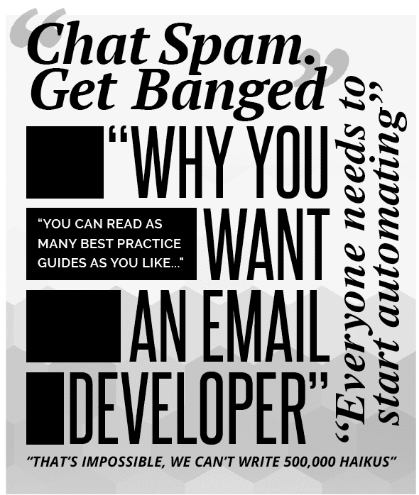 As a taster of the email guide, here's one of our favourite pieces aptly titled 'Chat Spam. Get Banged.' By Russell Dawson. This includes lots of practical tips on email marketing. It focuses on how to push back against colleagues who are suggesting an email is sent which could impact the list, i.e. How to place a financial cost against bad stakeholder emails, or why testing bad ideas is a good idea!
