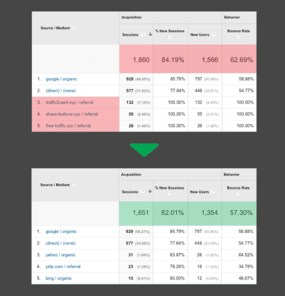 Chances are, you’ll see visitors from sites like 'social-buttons.xyz', 'top1-seo-service.com’, or even ‘vice.com’, but that those users display odd behaviour, like spending no time on your site. These visitors are spam bots. Doing analysis on a bad data set is meaningless.