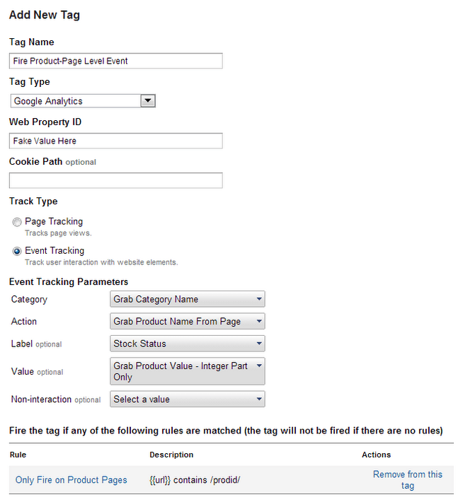 There are also options to use it in more advanced analytics using Event Tracking. Thanks to Dan Barker who has created this example on Google+ to illustrate this. This will fire a Google Analytics event that captures the product category, product name, product value and stock status, and to only do that when a visit hits a product page (not a real world use-case, but a good illustration).