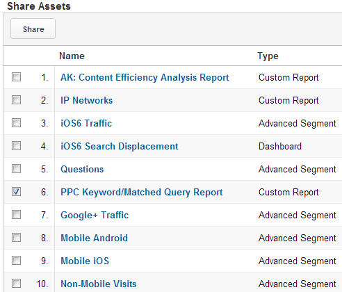 shared-assets-google-analyticsIf you click on ‘Share Assets’ it will load up a list of reports, segments and dashboards associated with that profile. From here you can check any of the reports, dashboards or segments which you would like to share.