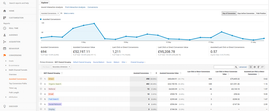 Bear in mind that data in the Multi-Channel Funnel reports takes a couple of days to come through- a good excuse for why you haven’t completed those monthly reports yet. There are a few other differences between regular reports and Multi-Channel Funnel reports too, such as how conversions are attributed to direct traffic, but I won’t go into that here.