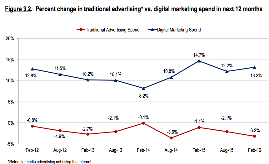 Separate data from CMO survey also confirms this big shift to digital. Their data shows consistent double digital rises in digital ad spend since 2012. This is showing no sign of slowing down, with a healthy 13.2% digital budget increase for 2016.