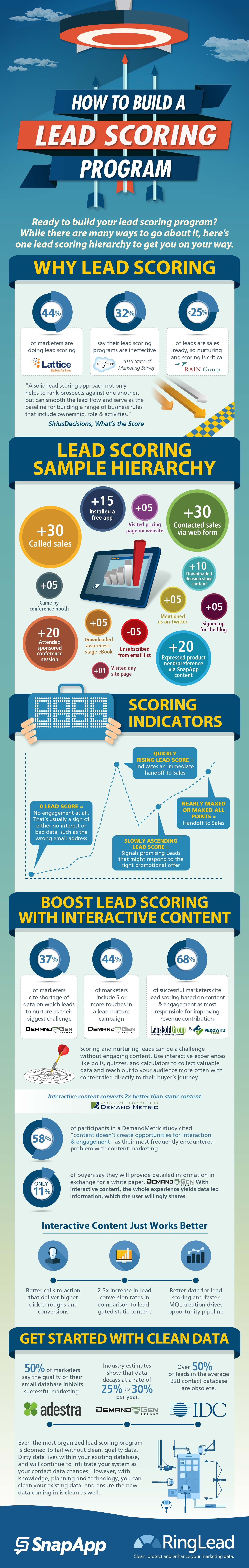 The research from Snapapp and RingLead identifies that over 44% of companies have active lead scoring programs yet 32% are not successful with their programs. It goes on to say that companies will automatically fail if they do not address their data cleaning and accuracy, and shares both scoring indicators and how to improve your programs through a scoring hierarchy.