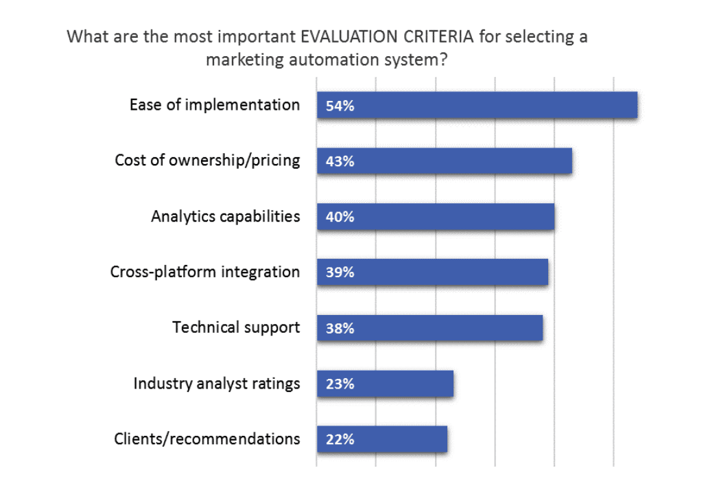 In the chart below we can see that the most important reason why a business goes with a specific marketing automation platform. 54% said that it was the ease of implementation. Now, I have implemented a fair few marketing automation platforms and ESPs, and yes they are a ball ache and can take a lot of time and planning. But is this really a fair reason to go with a specific platform and spend all that money? Just because it's easy? I do no agree with this at all.
