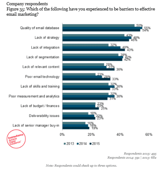 Companies realise that MA is important yet there still appears to be many barriers or challenges to overcome. The report unfolds that email marketers need to be efficient with their resources and more effective. More than 1/2 of respondents agreed that the lack of a 'quality email database' was a barrier to this as show in the graph below, along with a lack of strategy and integration.