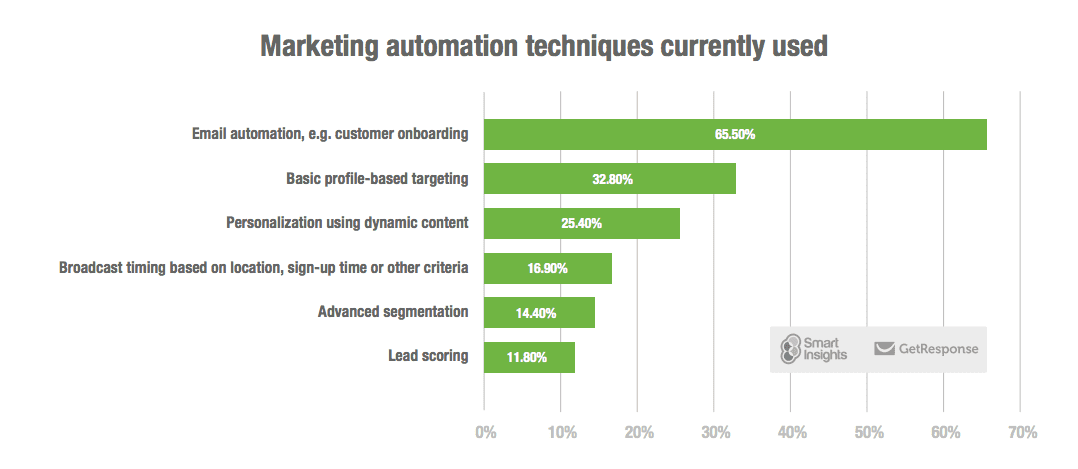 In the chart, we can see that Email Automation is the most popular at 65.50%, which is expected. The chart also shows how little people either know or use lead scoring, as it's only at 11.80%.