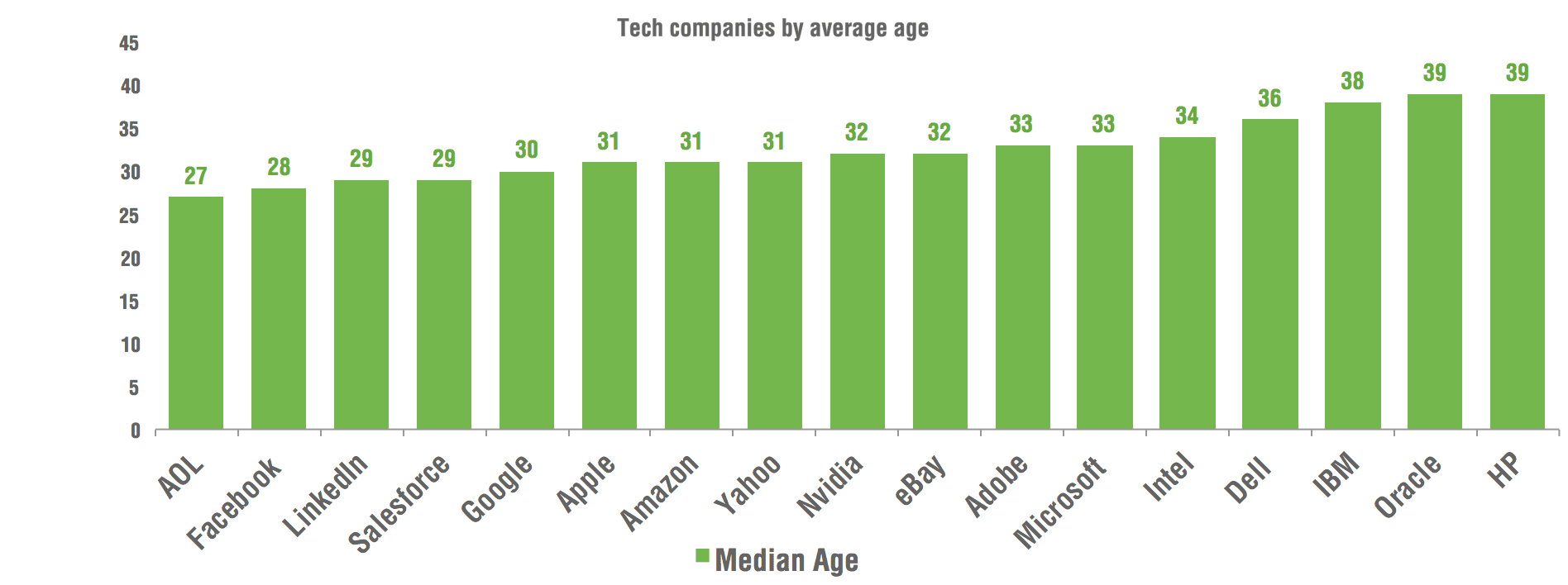 So does the average age of a company's employees say anything about its dynamism? Well, maybe I'm a little biased because I'm still a little wet behind the ears, but I think it might just have something to do with it. The chart below shows innovative companies like Facebook, LinkedIn, Salesforce and Google all having considerable younger median ages than the likes of IBM and Oracle. Don't get me wrong, the latter two are great companies, and probably have a fair bit to teach up and coming tech unicorns. But their corporate cultures just aren't as attractive as the newer start-ups. Working at IBM just doesn't sound as exciting as working at Facebook or Google. Don't agree with me? Facebook and LinkedIn are 5th and 6th respectively on the Glassdoor rankings of top companies to work for, whereas IBM didn't make the top 50.