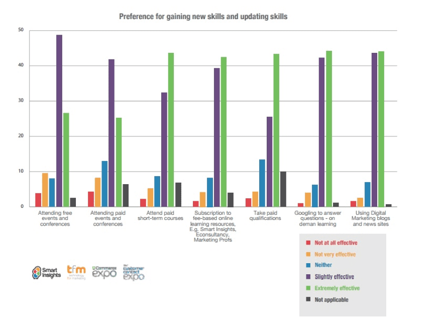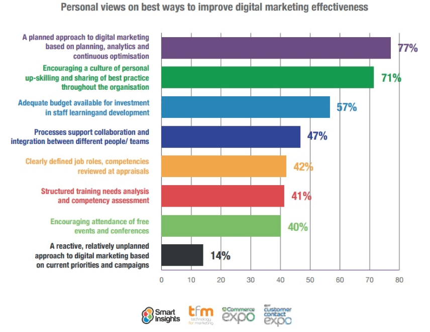 A lot of people are still somewhat put off by this digital revolution. Some, as mentioned earlier, fear their jobs are in danger if these solutions are set in place. Others are still nervous about security concerns when it comes to cloud solutions, and still, others feel digital technologies will replace the human touch, and make the digital landscape fully automated and therefore sterile. The chart below illustrates personal views on ways to improve digital marketing effectiveness, and shows how companies need to focus on proper planning and encouraging a culture of personal up-skilling by investing in their employees' development.
