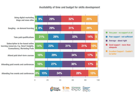 Luckily, as digital tools are evolving, so are the means of training employees to use them. By providing online support and tutorials, there are many ways in which companies can empower their talent to adjust to the shift on their own. Many employees deem these tools quite useful when it comes to improving their skills. This is one area in which both corporate allocation of funds and time and employee demand seem to overlap, if we compare the previous chart with the chart below.