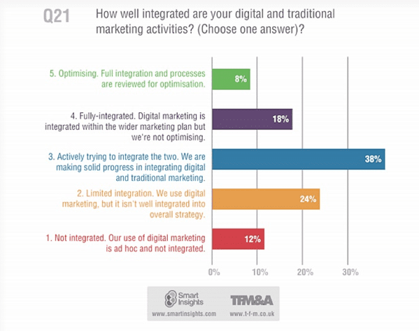 When asked whether or not they have integrated their digital and traditional marketing activities, many respondents claimed their digital marketing plan was either not integrated or not optimized properly.
