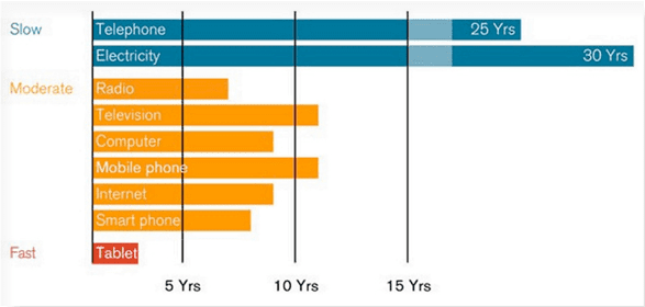 According to an IDC forecast, by 2019, companies will have spent over 2 trillion dollars on digital transformation technologies. Since it does not require a complex physical infrastructure, and so much time and effort is invested in developing this field, digital technologies are rapidly evolving. The chart below shows the speed with which new technology is adopted, depending on the infrastructure they require.