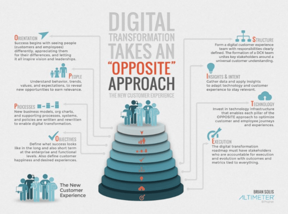 Change always starts with one step and more often than not, I found that zeroing in on the digital customer experience uncovers areas of immediate opportunities to learn, experiment and eliminate existing hurdles and points of friction in the customer journey. Altimeter's "OPPOSITE" framework is an acronym that represents the best practices guiding transformation efforts around the digital customer experience.