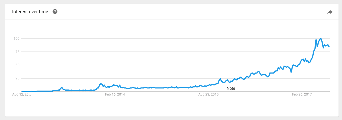 Above, the graph showcases the increasing interest in blockchain as a search term.
