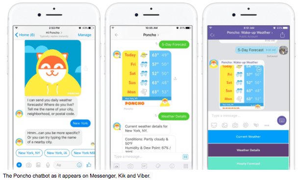 The Poncho chatbot on Messenger, Kik and Viber gives users personal weather forecasts based on their specific location, and can even supply them with morning and evening forecasts to help them better prepare for the day. The bot also supplies a weather report for runners who’d like to better prepare for the outdoors.