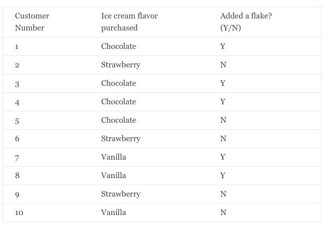 These insights are easy to establish because the data set is so simple. But imagine I gave you the purchasing habits of every customer of a major supermarket and ask you to draw insights out. Every customer is purchasing hundreds of different items a week, there are no obvious rules, what they purchase each time varies massively, and there are millions of customers. No human could possibly make sense of this data because of the vast numbers involved. But by leveraging the power of computers using machine learning it is possible to infer incredibly precise insights that allow markets to make useful predictions about the future behavior of their customers.From this data, we can easily draw out the following insights. People who order vanilla have a 66.6% chance of adding a flake to their order, people who opt for strawberry have a 0% chance of ordering a flake, and people who order chocolate have a 75% chance of getting a flake.