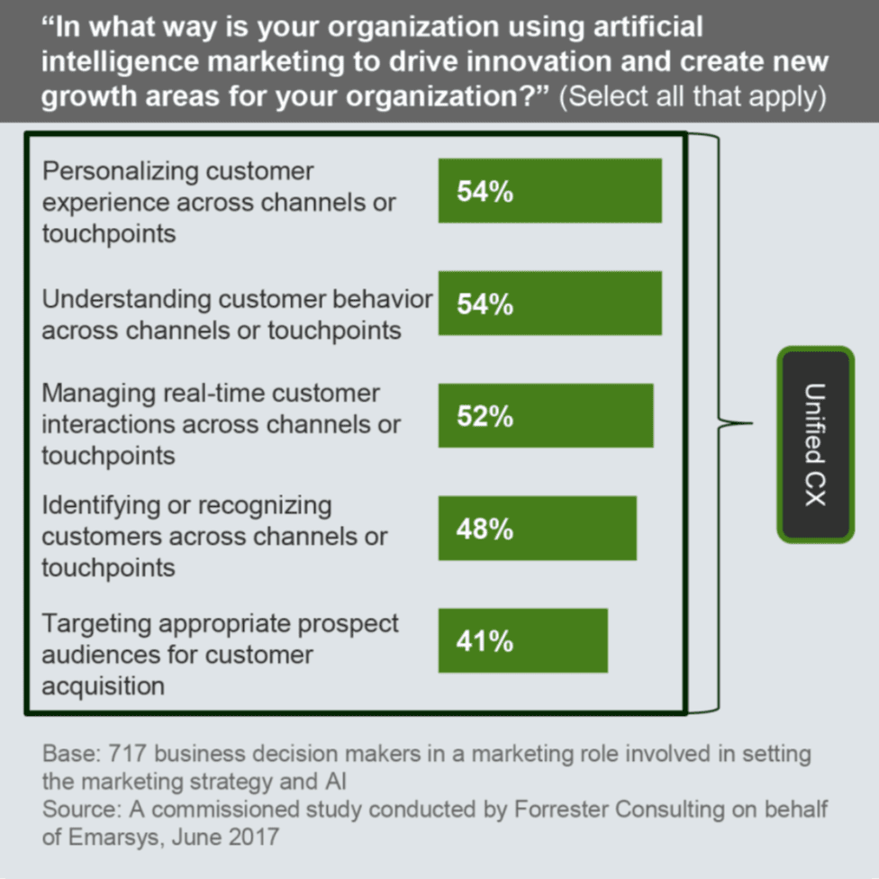 More than half of global marketers are using AI for personalization, to understand cross-channel customer behavior, and manage interactions. Source: Building Trust And Confidence: AI Marketing Readiness In Retail  And eCommerce, Emarsys & Forrester, June 2017