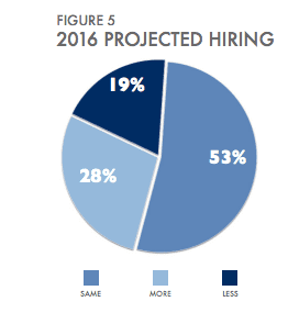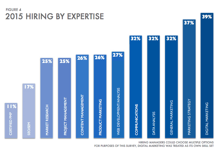 Looking back at the data from 2015, we can see that digital marketers are highly sought after, being the most hired type of marketing professional in 2015. Of the companies surveyed 39% hired a new digital marketer, whilst only 1 in four hired a new project manager. This is interesting as in 2014 project manager was in the top three most hired positions in 2014. This may be indicative of a rapid shift towards more agile marketing departments that require digital skills.