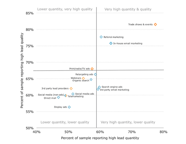 This four quadrant presentation can help prioritise your focus according to your business goals. For generating high quantity and quality leads, Trade Shows, Referral Marketing and in-house email marketing were the best channels. Bear in mind, that this is from a sample of 200 B2B marketing organisations in the United States.