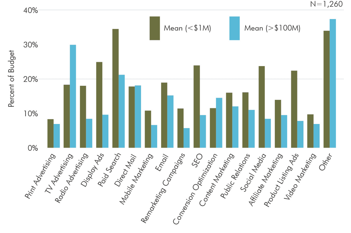 Based on a survey of over Over 4000 respondents, the eMarketing Sherpa eCommerce Benchmark Study summarised what percentage of marketing budget ecommerce brands are spending per channel based on the company’s revenue:
