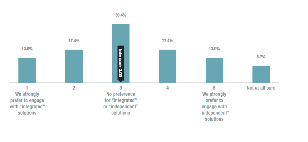 There was no clear preference of 'Integrated (stack-approach)' which manages multiple functions in one platform vs 'Independent model' with a focus on one or a handful of specialisms. 30% of respondents had 'no preference for integration' and 15% were planning on using an 'independent solution'.