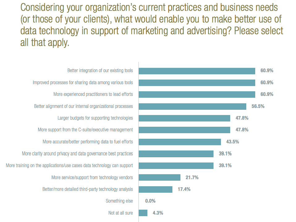We know that a single system will never a sole solution across marketing and requires additional factors. It's the old saying that it's only as good as the data, the people, the processes, the strategy and it goes on.. The research supports this, and highlights that businesses are looking for 1. improved system integration 2. Better processes for data sharing and 3. skilled colleagues to drive their strategy.