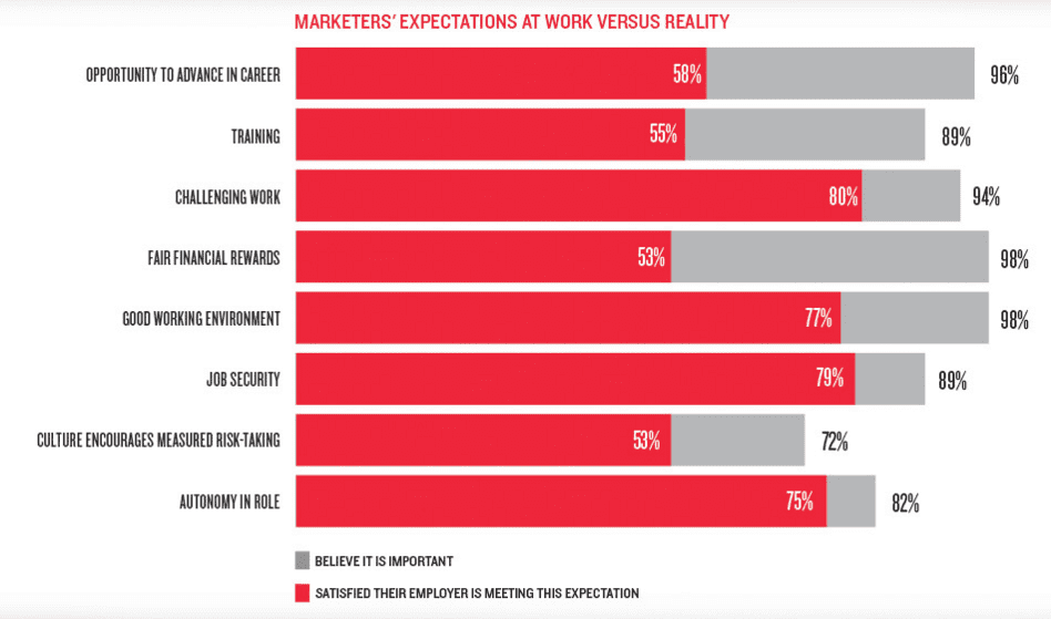 Marketers are extremely likely to consider changing jobs. 9 out of 10 Marketers think they are likely to have changed jobs by the time 2019 comes around. Is your marketing department ready for that kind of turnover? Could investment in training for skills development help?