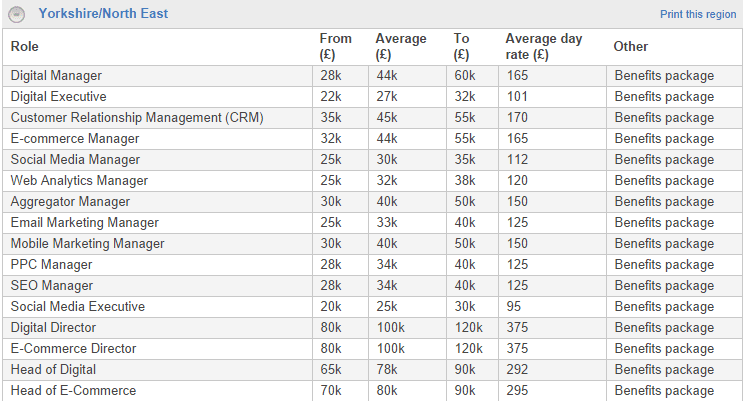 Michael Page's interactive salary checker tool is a great way to check out salaries by county, sector, and digital specialism. Here is an example of salaries for roles in Yorkshire and the North East: