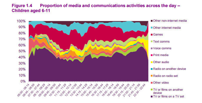 As mentioned earlier, this age group prefer to instant message or text their network, and 30% of their media consumption takes place between 6am to 6pm. In terms of media overall, they watch few programmes on the TV itself, though this could be distorted by the use of tablets and mobile devices. Looking at their activity, the young digital natives spend a high proportion of their time playing games as shown: