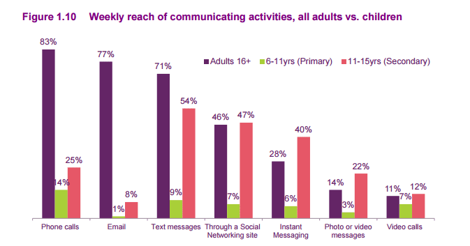 Over half of children's time is spent communicating via text, instant and photo messaging - this contrasts to 1/4 of the time spent by adults. In terms of social networking sites, 11-15 year olds spend twice as much time as adults.