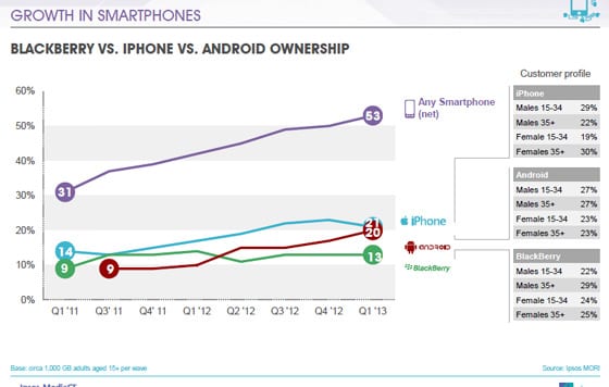 Increase since 2011, up to 53% of respondents owning a smartphone and the younger males prefer the Iphone and Android.