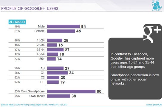 The findings also highlighted that 'In contrast to Facebook, Google+ has captured more users aged 15-24 and 35-44 than any other age group. Smartphone penetration is now on par with other social networks!'.