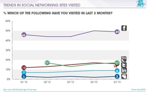 IPSOS Mori has released their 'Tech Tracker Survey for first Q2013' which has some great insights into Internet Usage - 50% of British Adults access social networks, 16% using Twitter and 17% have used Google+.