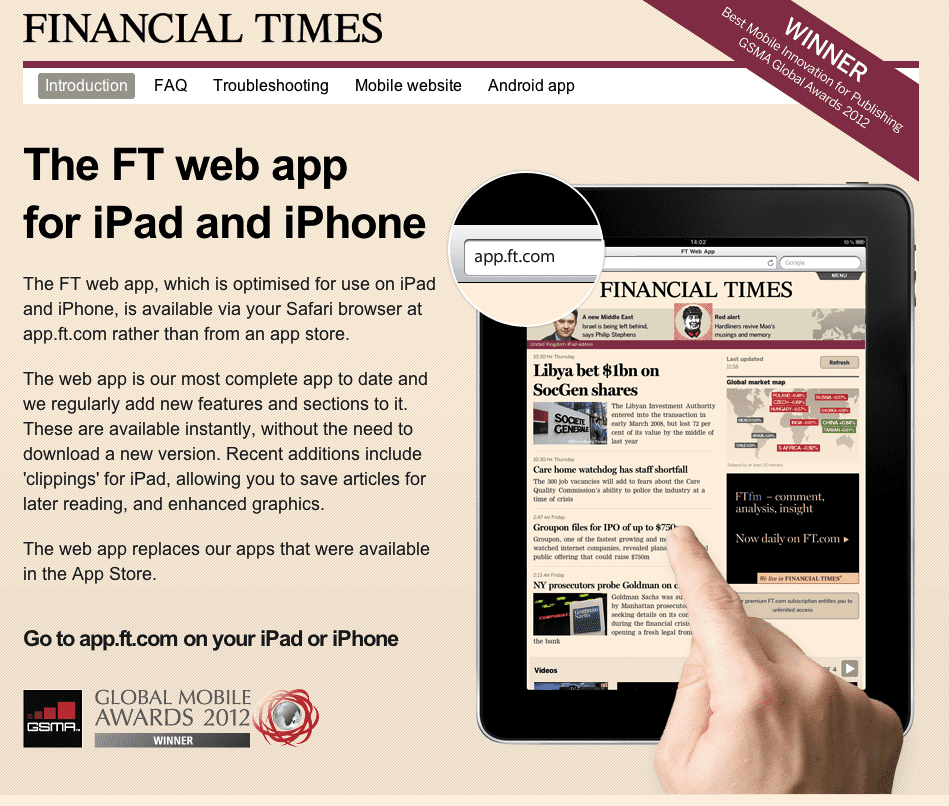 Imagine if your app could reach customers who don’t have it installed on their device. That is what Android Instant Apps can do. It makes accessing an app, not on a device as simple as opening a web page. It does this by only accessing the code needed by the app at that moment. This means your business can come up on an app search, and the customer can use your app without having to have downloaded it first. You can see an example of a progressive web app from the FT below: