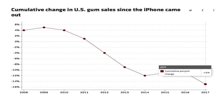 People are so transfixed to their phones that traditional last moment point of sales purchases at checkouts like chewing gum have declined by 15% since 2007.