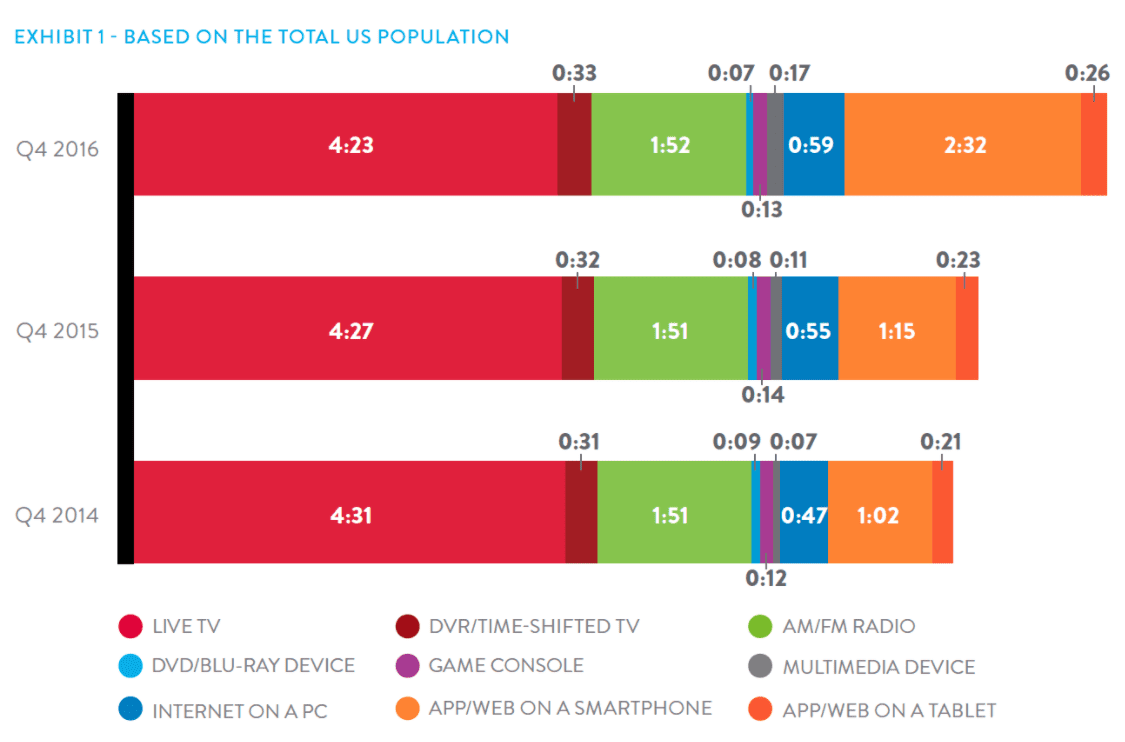 Time spent on smartphones has more than doubled, but this seems to complement rather than compete with TV viewing. The lesson is simple - rapid mobile growth is happening, but it doesn't mean old mediums are dying.