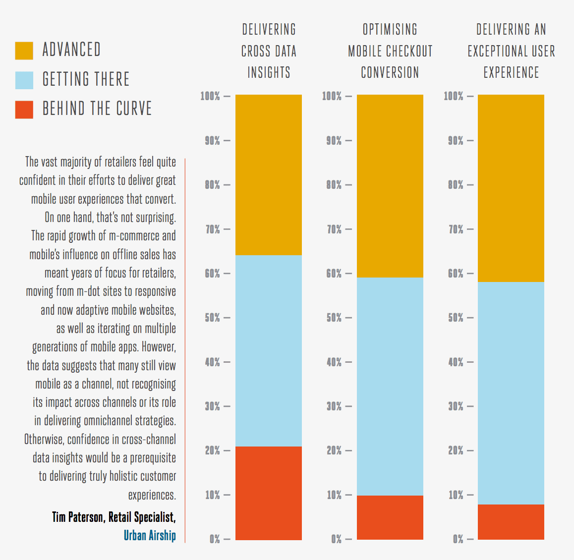 Now it's 2016 retailers are finally starting to really get a handle on mobile. A few years ago departments were floundering around without a strategy, but now about a third or more consider themselves advanced, and the majority of the rest consider themselves to be 'getting there'. Only 10-20% consider themselves to be behind the curve. This is a sign of growing confidence, although when you think about it by definition 50% must be below average, so if you think you're ahead of the curve, you may be one of the many people who are wrong.