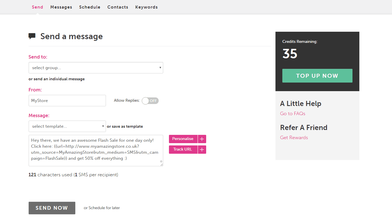 This link can go straight into your SMS message – but you’ll want to shorten it down first. Just pop it in to your SMS URL shortner so that your link is shortened when it is sent out. Shortened links are tracked and look much sleeker in the message you send, plus you’ll only use 20 characters leaving much more room for you to be creative and compelling with your campaign content.