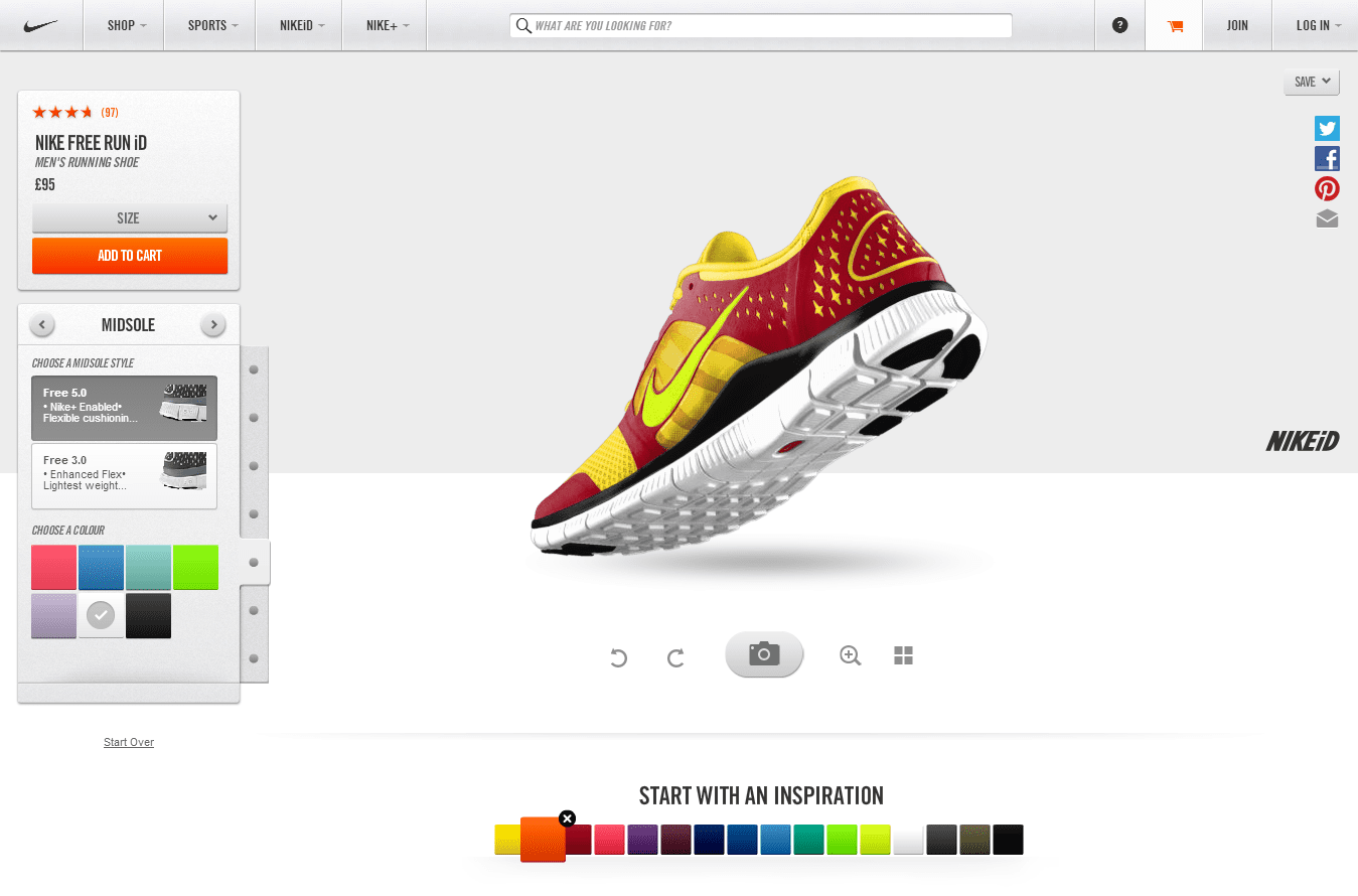 A great personalized online brand product experience comes courtesy of Nike. Nike ID allows you to use their website to personalize your apparel with color and messaging. This fits Nike’s highly personalized and user-connected brand experience which offers personal and complementary products such as Nike + and Nike Fuel.