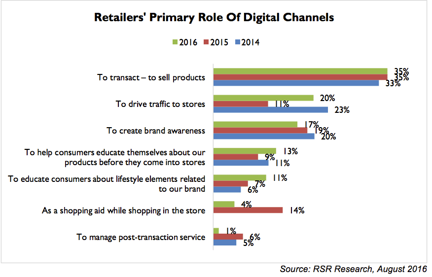 In this research from RSR Research, we see that while the primary role of digital channels is to sell products, in second place is for digtial to drive people to store with 23% of respondents saying that it as the primary role of their digital channels. The interesting aspect here is the shift over the last 3 years, indicating that retailers saw digital as a primary driver to get people into the store in 2014 (23%) but in 2015 we see a key strategic shift to keep people online to purchase via their E-commerce store as the drive to store dropped to 11%. 2016 saw a resurgence of brands utilising digital channels to promote their in-store offerings with 20% saying that digitals primary role was to drive people into stores.
