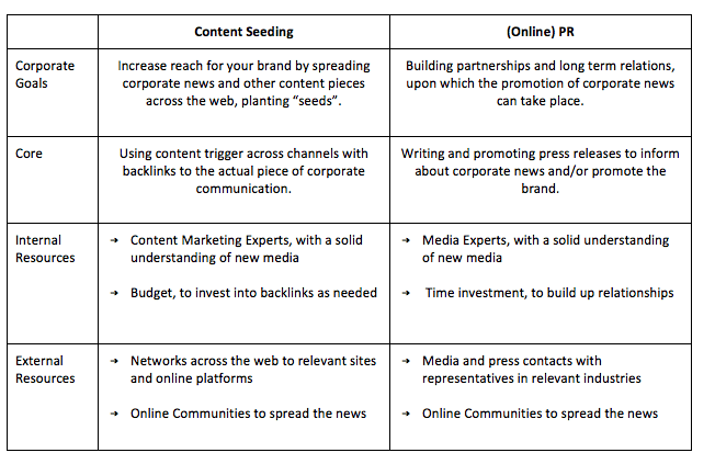 In the light of these advantages, it seems like smart idea to use Content Seeding techniques as the “new PR”. However, Content Seeding has different goals than PR, hence it requires different skill-sets, resources and ultimately serves a different purpose, in a nutshell: