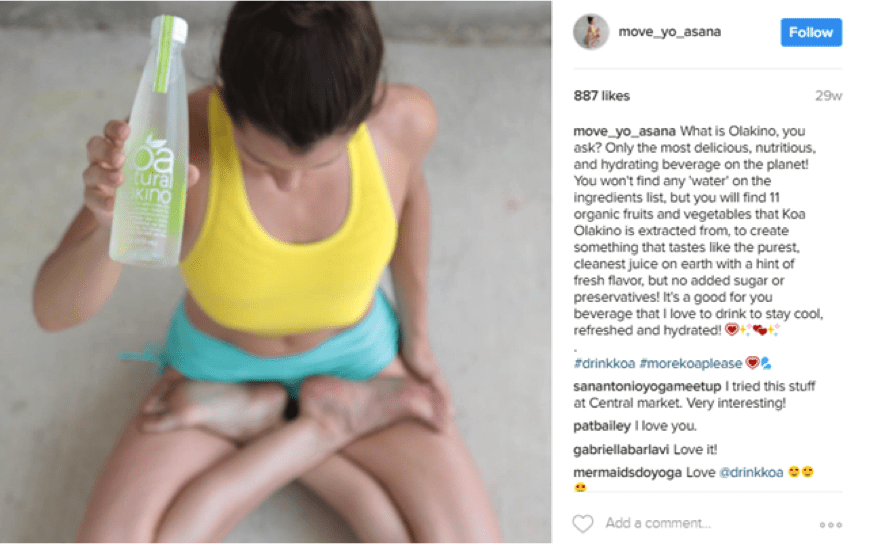 Koa sent out samples of their products to these influencers, who then turned into huge fans. The product fit with their subject matter specialization, which helped the brand connect with a highly relevant audience. Yoga influencers like Andrea Taylor (@move_yo_asana) featured images of the products in their content, and promoted its benefits in their captions.