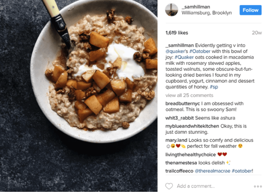 This strategy worked effectively for PepsiCo to promote their Quaker Oats, according to a HYPR case study. The PepsiCo team worked with a community of micro-influencers and regular influencers, who posted Instagram images featuring the products. The images included recipes in the captions so their followers could recreate them.