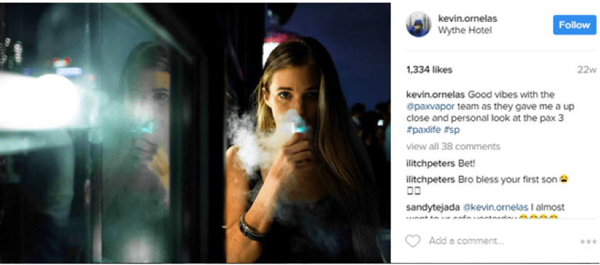 The New York event included photographer and cinematographer Kevin Ornelas, who has around 75,600 followers. He posted a photo of a model using one of the PAX Labs products, which was distributed to influencers at the event.