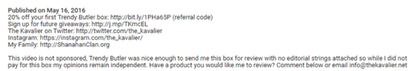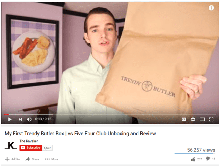 Trendy Butler used this tactic by sending out one of their boxes for free to men’s fashion YouTuber, The Kavalier, who has around 6,500 subscribers. The YouTuber created an unboxing video in which he reviewed their service, and provided his viewers with his honest opinion about it.