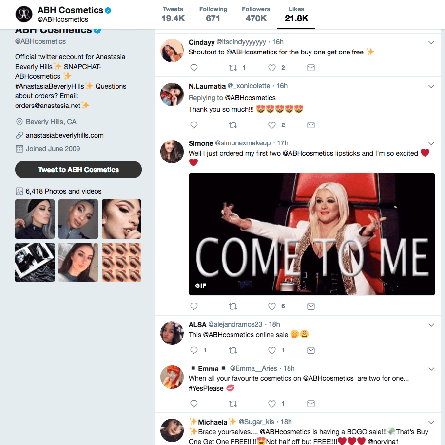 By liking and retweeting tweets sent by customers, it shows up on their feed and user's home feed. I see all the time 'real people' (i.e. not celebrities) sharing how wonderful ABH cosmetics are, and the more people see this on their feed the more likely they are to purchase their own.
