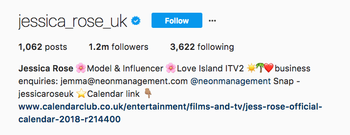 UK reality TV star, Jessica Shears, soon came off air and started promoted different products in instagram posts and was quick to label herself an 'influencer' on her Instagram bio.