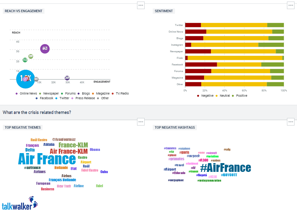 The top two charts show the reach and engagement of mentions about your company divided by media types (top left) and the sentiment chart (top right) shows the positivity and negativity by media type. The theme clouds below them hone in on just the negative topics and hashtags that are being discussed in relation to your brand.