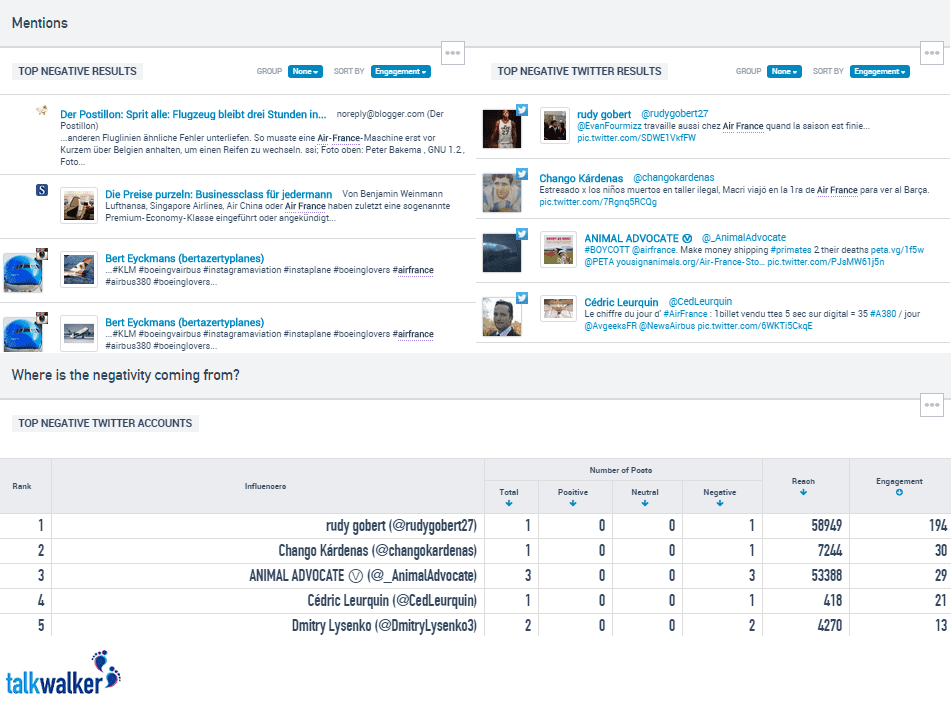 The top results (top left) show all the results classed as negative across all media channels whereas the results on the top right show only negative Twitter results. The table below them shows the Twitter accounts that have posted the largest number of negative results sorted by the level of engagement they have generated.